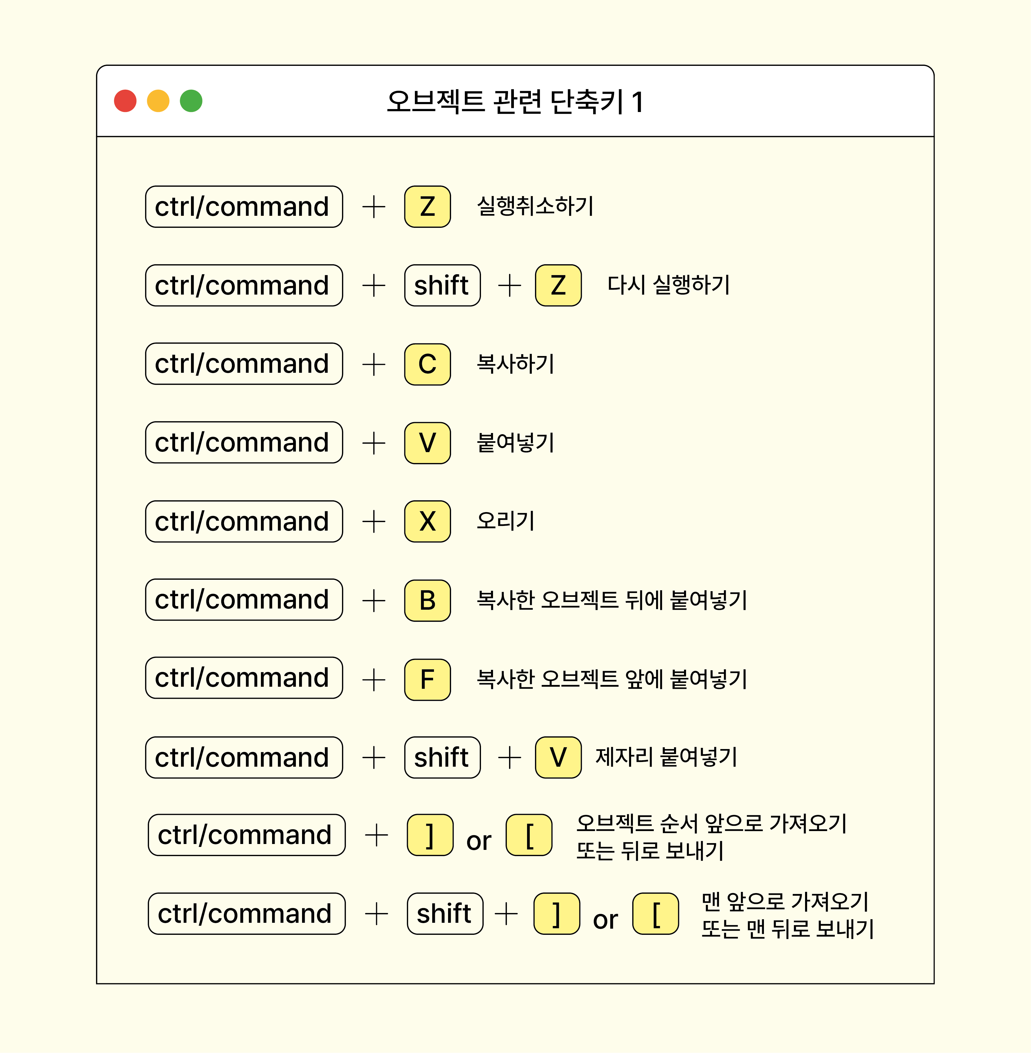일러스트작업은 벡터로 이루어진 오브젝트에서 시작해서 오브젝트로 끝난다고 해도 과언이 아닌데요, 이 오브젝트 작업을 할 때 작업의 효율을 높혀주는 단축키들입니다. 실행취소 단축키[ctrl/command+Z]는 거의 숨쉬듯 사용하는 단축키라고 할 수 있고 복사하기[ctrl/command+C] 붙여넣기[ctrl/command+V]도 또한 정말 많이 쓰입니다. 그리고 오브젝트끼리의 순서도 중요하기때문에 오브젝트를 앞으로 가져오고 뒤로 보내는 ctrl/command+ ] or [ 키도 많이 쓰입니다.