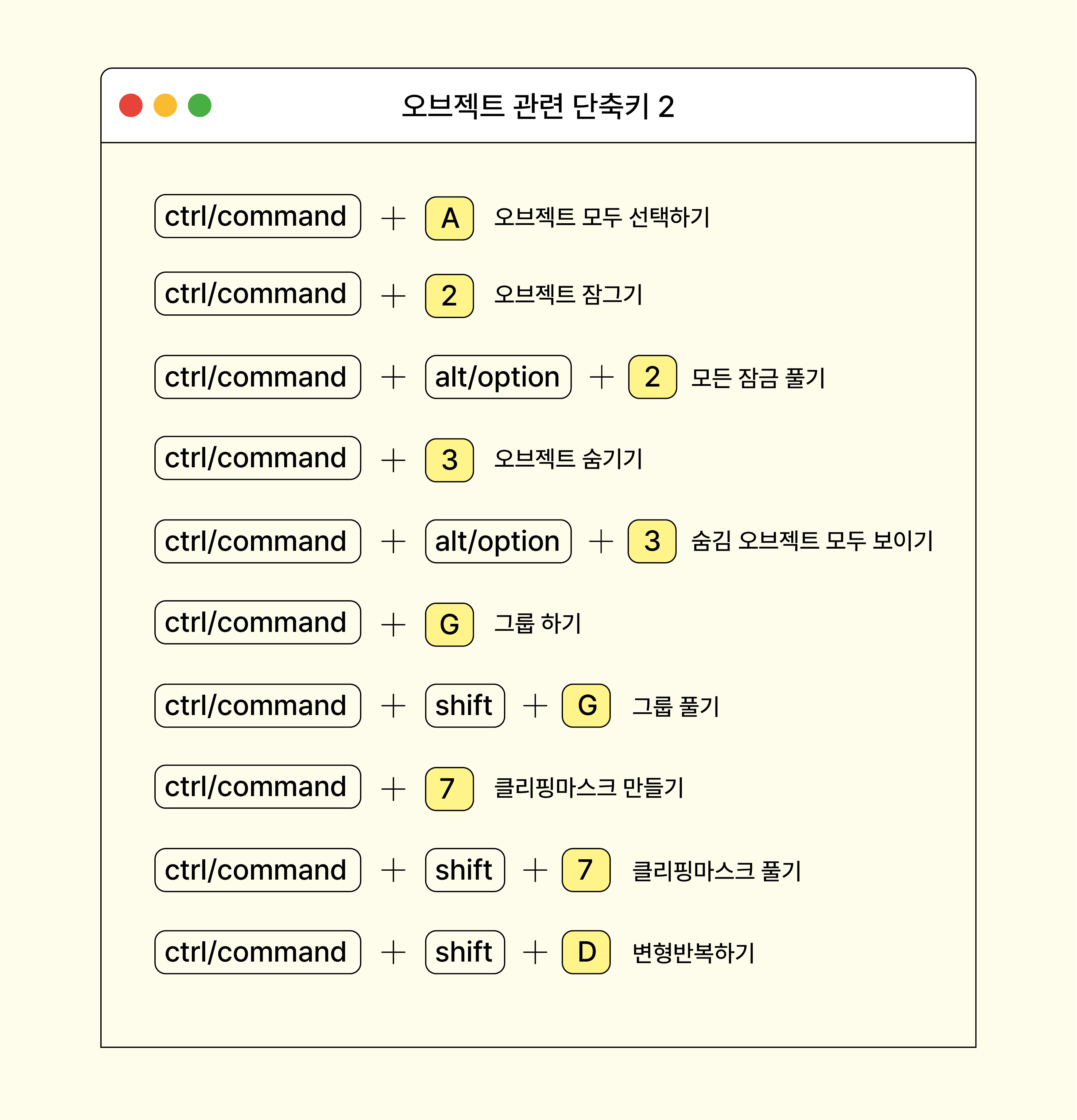 오브젝트가 많은 작업을 할때 오브젝트 하나만 움직이고 싶을때 다른 오브젝트들은 잠금을 한 상태로 움직이면 더 편하게 움직일 수 있는데요, 그럴때 쓰는게 오브젝트를 잠궈주는 단축키[ctrl/command+2]와 오브젝트를 숨겨주는[ctrl/command+3] 단축키입니다. 숫자로 된 단축키라 기억하기는 쉬워요. 또한 클리핑마스크 만들기 [ctrl/command+7]도 정말 많이 쓰여요. 변형 반복하기 [ctrl/command+D]는 패턴을 만들때 쓰이기도 해요.