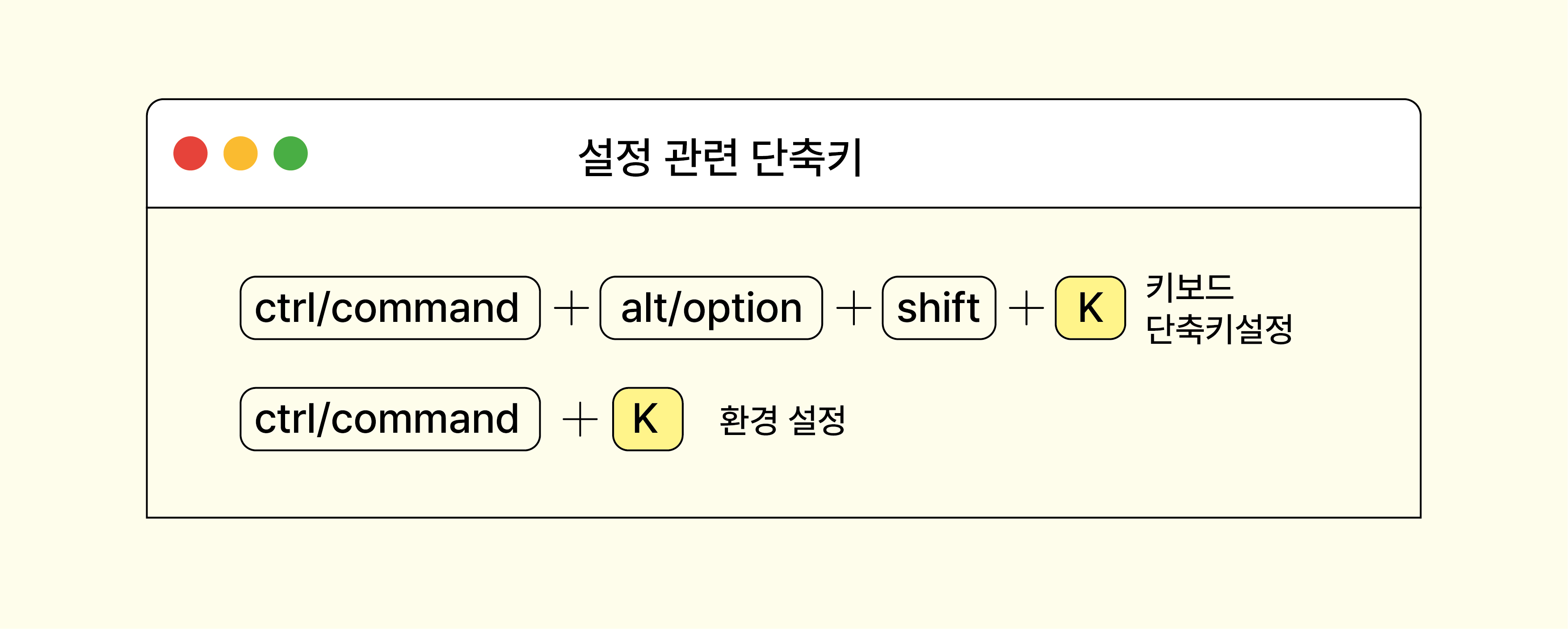 단축키 설정을 확인 할 수 있는 단축키[ctrl/command+alt/option+shift+K]와 환경설정 키[ctrl/command+K] 입니다. 원래 설정되어있던 단축키가 불편하다면 키보드 단축키 설정에 들어가서 바꿀수도 있어요!