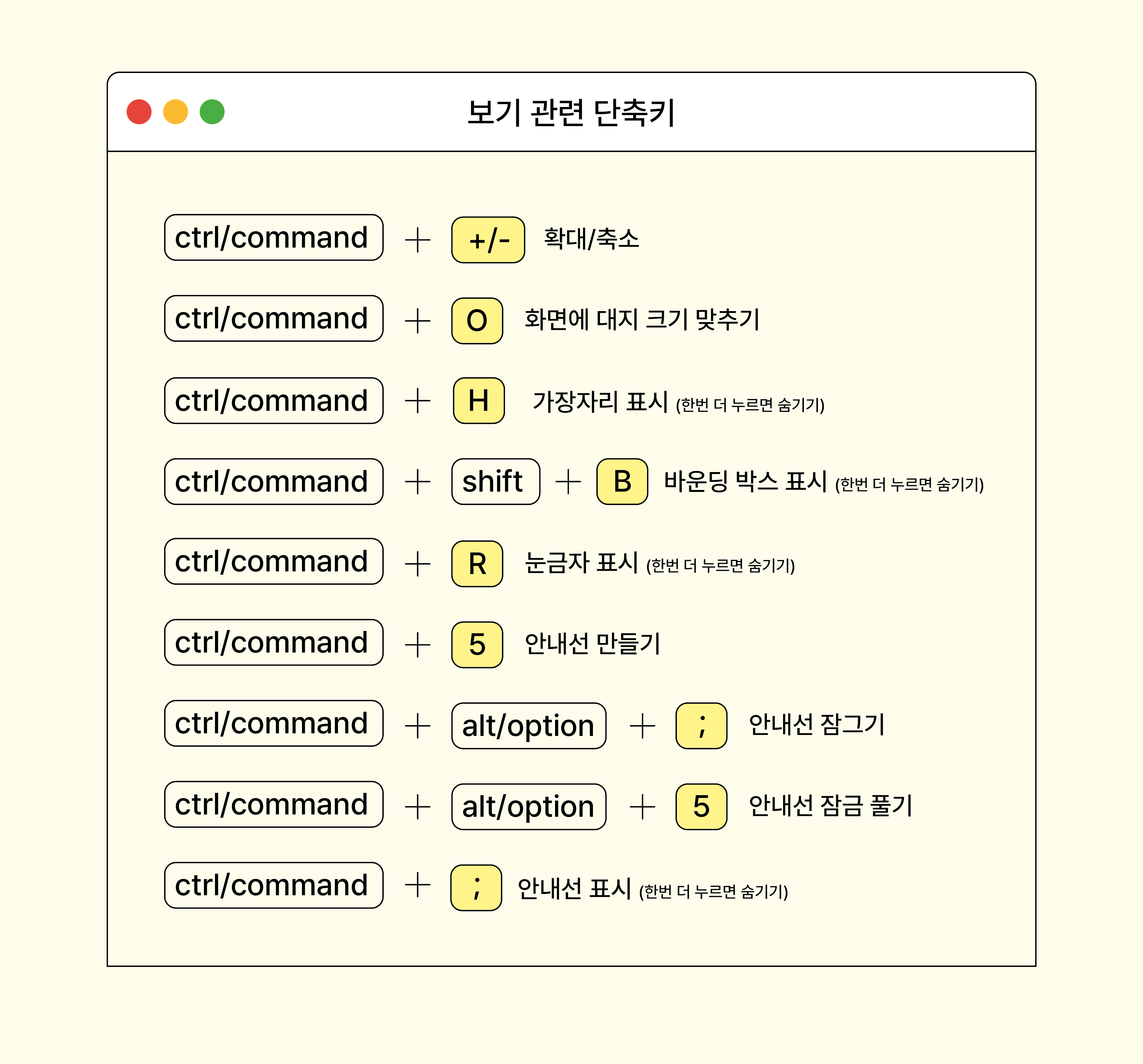 그리고 작업을 할때 보통 레이아웃을 맞추기위해 안내선을 켜놓고 작업을 하게 되는데 시안을 확인할 땐 안내선이 있으면 불편하겠죠? 그럴땐 안내선 숨기기 단축키[ctrl/command+;]를 통해서 간단하게 없앨 수 있어요.