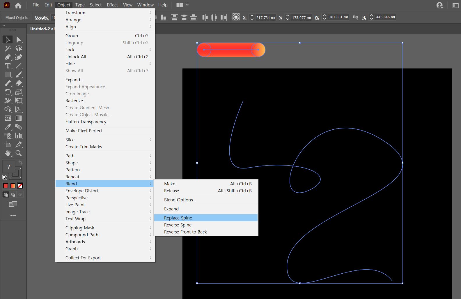 Object(오브젝트) >> Blend(블렌드) >> Replace Spine(스파인 바꾸기) 를 클릭합니다.