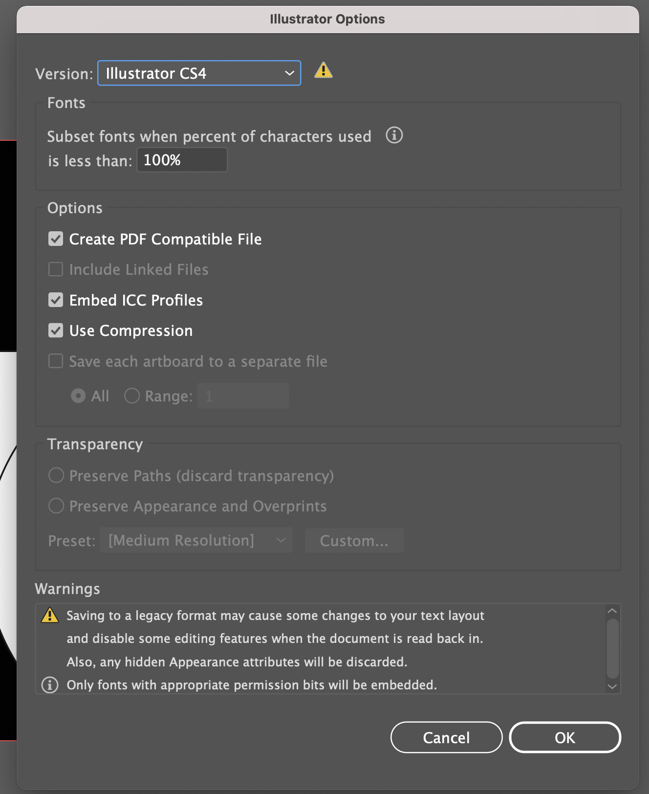 보통 일반 회사나 개인이 쓰는 일러스트는 버전이 대부분 2022나 2023년도인데, 인쇄소는 그보다 버전이 낮은 경우도 많고 또, 같은 버전이라도 파일 호환이 안 되는 경우도 있어서 안전하게 버전을 cs4정도로 낮추어서 저장해 주는 게 좋습니다.