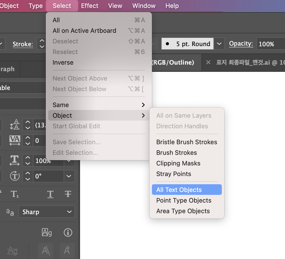 글자 중에도 안 깨진 글자가 있는지 없는지 확인하려면 Select-object-All Text Objects를 눌러보시면 이미지화가 되지 않은 텍스트가 있으면 확인할 수 있습니다.