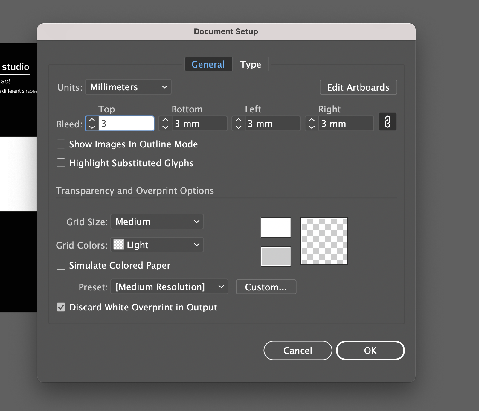 2. Document Setup화면이 뜨면 Bleed를 3mm로 맞춰줍니다. 보통 한 개만 적어주면 Top, Bottom, Left, Right가 함께 바뀝니다 (맨 오른쪽 연결고리가 활성화되어 있을 때 한정)