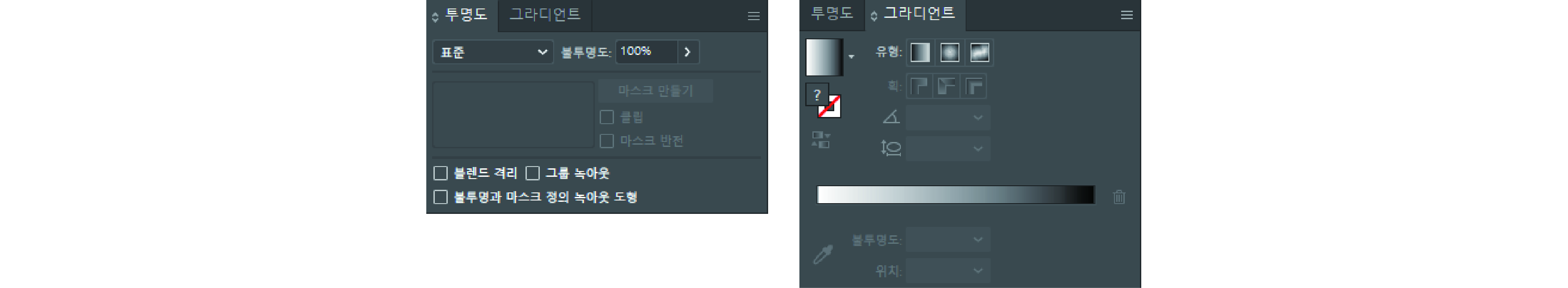 그라디언트(Gradient) : 두 가지 이상의 컬러를 사용하여 변화를 주는 그라디언트 도구를 수정, 변경하는 패널입니다.