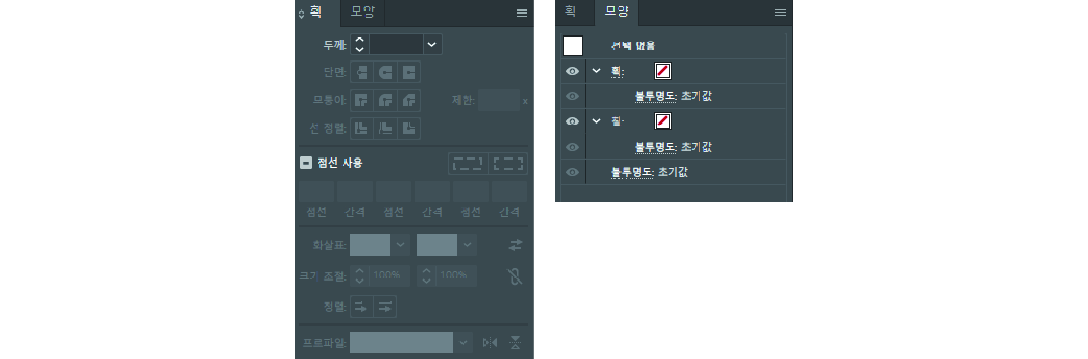 브러쉬(Brushes) : 선의 모양을 변경할 때 사용하며, 주로 사용하지는 않습니다.